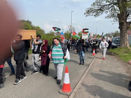 A large contingent from Greater Manchester PSC arrived with drums, flags, symbolic babies wrapped in swaddling clothes, and a coffin symbolizing dead Palestinians.